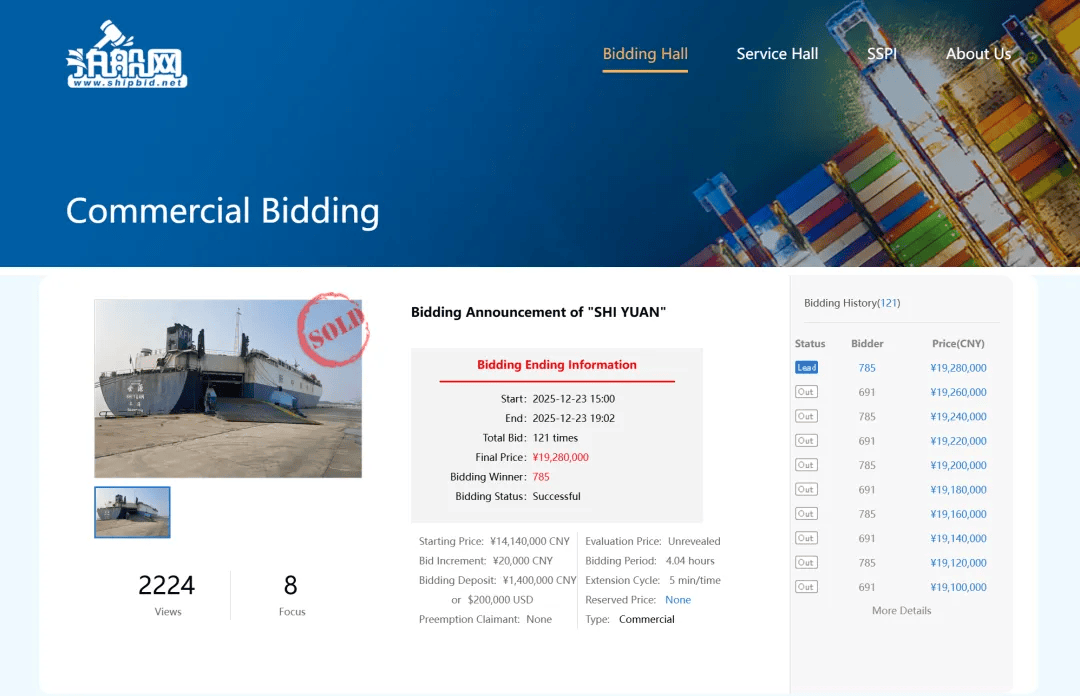 12月23日,经过121轮激烈竞价,滚装船“世源”轮竞拍项目在“拍船网”平台上以1928万人民币的价格成交。至此,浙江拍船网今年度交易总额已达103.78亿元,在去年“首破百亿”基础上再创新高,为“十四五”收官交出高分答卷。